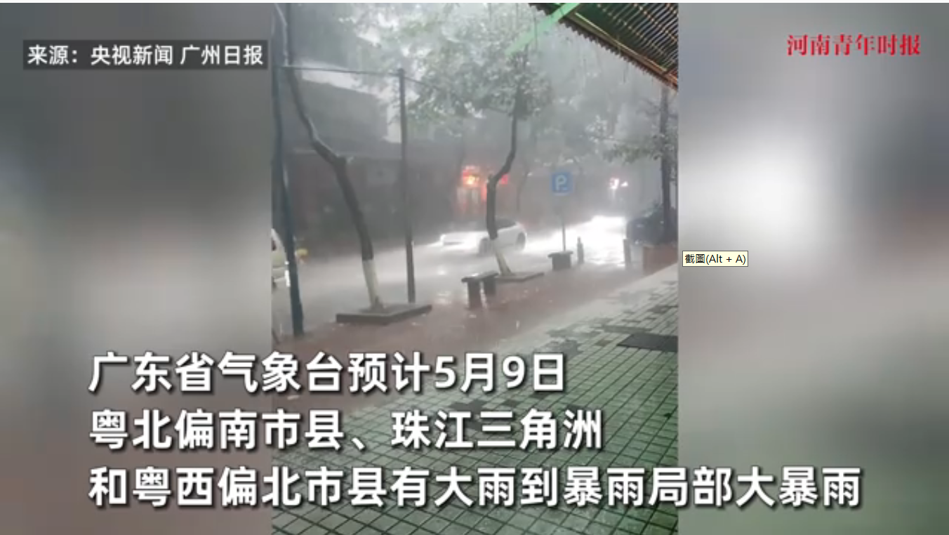 (視頻截圖) 廣州市氣象部門提醒市民避免涉水行車,尤其是積水深度不明的路段,車輛熄火後切勿滯留車內。市民應盡量待雨勢減弱後再出行,並遠離路邊帶電設施。 根據氣象預報,華南地區的強降雨將持續至5月10日,11日起南方大部將迎來3天左右的晴朗天氣。廣州市氣象台預計,10日仍有短時強降水,需繼續防範次生災害風險。 9日上午廣州、深圳、珠海、東莞等地均發布暴雨預警,廣東全省暴雨預警一度超過100個。截至9日14時07分,廣東仍有20個暴雨預警生效,另有17個雷雨大風預警生效中。廣州白雲機場、深圳寶安機場出現不同程度的航班延誤。(完) 【編輯:李彥洲】