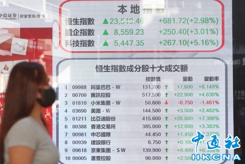 香港中通社5月12日電(記者 徐嘉儀)中美貿易談判12日達成重要共識,大幅暫緩4月後關稅執行,港股一度飆升逾800點,創逾一個月高位。恆生指數收市報23549點,升681點。大市成交額為3224億港元。