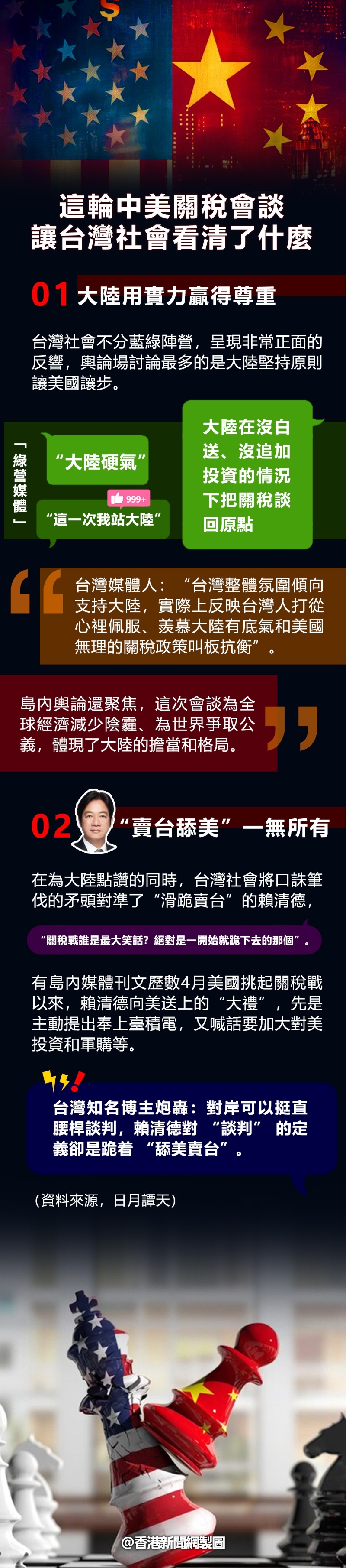 香港新聞網5月14日 當地時間5月12日,中美經貿高層會談後,雙方發佈《中美日內瓦經貿會談聯合聲明》,大幅降低雙邊關稅水平,基本取消了4月2日美國發動關稅戰以來加征的關稅。美國在會談中作出了讓步,中國幾乎得到了所希望的最理想結果。這輪中美關稅會談,也讓台灣民眾更加清晰認識到,大陸堅持原則與賴清德“滑跪”成癮。對台灣而言,世界上最值得依靠的是大陸,最害台的是“台獨”,最靠不住的是美國。