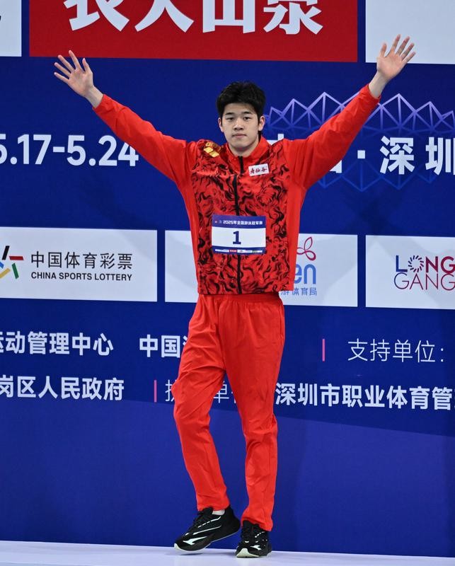5月19日,冠軍浙江壽仙穀隊選手潘展樂在頒獎儀式上。圖片來源:新華社 2025年全國游泳冠軍賽男子200米自由泳半決賽,孫楊以1分47秒47的成績成功晉級。19日晚,孫楊與潘展樂、汪順等名將展開200米自由泳決賽的爭奪。男子800米自由泳預賽則於19日上午舉行,已報名的孫楊缺席了比賽。