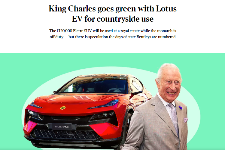 英國《泰晤士報》報道截圖 “英國國王近日訂購了一輛價值12萬英鎊的高性能蓮花(Lotus)電動汽車,進一步擴充了他令人矚目的豪車收藏。”《泰晤士報》在報道中稱,這款被稱為“超豪華電動SUV”的蓮花Eletre,兼具頂級性能與環保理念,將被送往查爾斯國王的某處王室莊園,供國王在非公務期間使用。 《太陽報》稱,查爾斯國王拒絕選擇近來爭議不斷的電動汽車生產商特斯拉,轉而購入來自蓮花跑車的純電動Eletre SUV。新車將特別噴塗為王室傳統的緋紅色,即所謂的“王室紫紅”。 《野獸日報》報道,英國王室長期偏好英國汽車,對勞斯萊斯、路虎和賓利等品牌情有獨鐘。但近年來,這些品牌大多被海外資本收購,生產活動也多已遷出英國。 據了解,蓮花跑車成立於1948年,是英國精品跑車品牌。2017年,中國吉利控股集團收購蓮花跑車,並於2021年成立路特斯科技公司,總部落戶湖北省武漢經濟技術開發區,整合中國、英國、德國研發設計機構及全球資源,面向全球市場打造超高端純電智能汽車。 根據蓮花跑車英文官網信息,位於英國諾福克郡海瑟爾的團隊負責Eletre車型的產品定義工作,生產製造則在武漢進行。美國彭博社、英國《鏡報》等媒體也報道稱,Eletre車型是在武漢生產製造的。 蓮花Eletre在英國的售價約為12萬英鎊(約合人民幣116萬元),續航里程約450公里。其雙電機動力系統可輸出905馬力,僅需2.9秒即可從靜止加速至100公里/小時,最高時速可達260公里/小時。