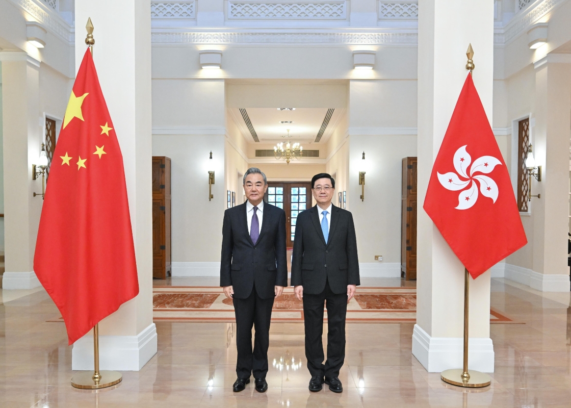 香港新聞網5月30日電 香港特區行政長官李家超30日在禮賓府歡迎親臨香港出席國際調解院公約簽署儀式的中共中央政治局委員、外交部長王毅,雙方共進工作午餐並就國際調解院的工作和香港特別行政區的國際交往合作等議題交流意見。政務司司長陳國基、財政司司長陳茂波、律政司副司長張國鈞博士和行政長官辦公室主任葉文娟亦有出席。