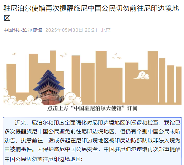 圖片來源:中國駐尼泊爾大使館微信公眾號 為保護旅尼中國公民安全,中國駐尼泊爾使館再次鄭重提醒中國公民切勿前往尼印邊境地區: 一、尼泊爾和印度之間為開放邊界,國界標識較少,尼印兩國公民可憑身份證件自由來往,但外國公民不能免簽證經尼泊爾前往印度。中國公民前往尼印邊境地區極易誤入印度境內,面臨被印度軍警拘捕風險。 二、印度對非法入境者懲處嚴厲,即使是誤入印境內亦會被拘捕和起訴,并可處2-8年監禁及罰金,且無法獲得保釋。請中國公民避免靠近尼印邊境,以防因個人疏忽或心存僥幸非法越界進入印度,承擔不必要的法律後果和個人損失。 5月9日,中國駐尼泊爾大使館就曾發佈領事提醒,提醒旅尼中國公民避免前往尼印邊境地區。 如遇緊急情況,請及時與中國駐尼泊爾使館聯繫尋求協助。 駐尼泊爾使館領事保護與協助電話:00977-1-4531511; 外交部全球領事保護與服務應急熱線(24小時):0086-10-12308或0086-10-65612308。 (完) 【編輯:紀東】