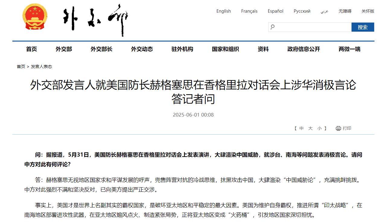 中國外交部網站截圖 前一天(5月31日),美國防長赫格塞思在香格里拉對話會上發表演講,大肆渲染中國威脅,就涉台、南海等問題發表消極言論。 中國外交部發言人表示,赫格塞思無視地區國家求和平謀發展的呼聲,兜售陣營對抗的冷戰思維,抹黑攻擊中國,大肆渲染“中國威脅論”,充滿挑釁挑撥。中方對此強烈不滿和堅決反對,已向美方提出嚴正交涉。 發言人指出,事實上,美國才是世界上名副其實的霸權國家,是破壞亞太地區和平穩定的最大因素。美國為維護自身霸權,推進所謂“印太戰略”,在南海地區部署進攻性武器,在亞太地區煽風點火、製造緊張局勢,正將亞太地區變成“火藥桶”,引發地區國家深切擔憂。 發言人強調,台灣問題純屬中國內政,任何外國無權干涉。美方不要妄想把台灣問題當作遏制中國的籌碼,勿要玩火。中方敦促美方切實恪守一個中國原則和中美三個聯合公報,停止為“台獨”勢力撐腰打氣。南海的航行和飛越自由從來都不存在任何問題。中國在南海問題上始終堅持同有關國家通過對話協商妥善處理分歧,堅持依法依規維護領土主權和海洋權益。美國才是破壞南海和平穩定的最大因素。 發言人表示,中方敦促美方切實尊重地區國家維護和平穩定的努力,停止蓄意破壞地區和平穩定環境,渲染衝突對抗、加劇地區局勢緊張。 據央視新聞報道,5月31日傍晚,針對美西方等個別國家在香格里拉對話會上對中國的無端指責,中國人民解放軍國防大學代表團團長、國防大學副校長兼教育長胡鋼鋒少將發言批駁。胡鋼鋒表示,不接受對中方的無端指責,有關內容無中生有,煽動對抗,企圖搞亂亞太,不得人心,也不可能得逞。 他指出,舉辦“香會”的初衷是為了研究問題,不是製造問題;是為了減小分歧,不是擴大分歧。應當坦誠交流,增信釋疑。(完) 【編輯:石歡歡】