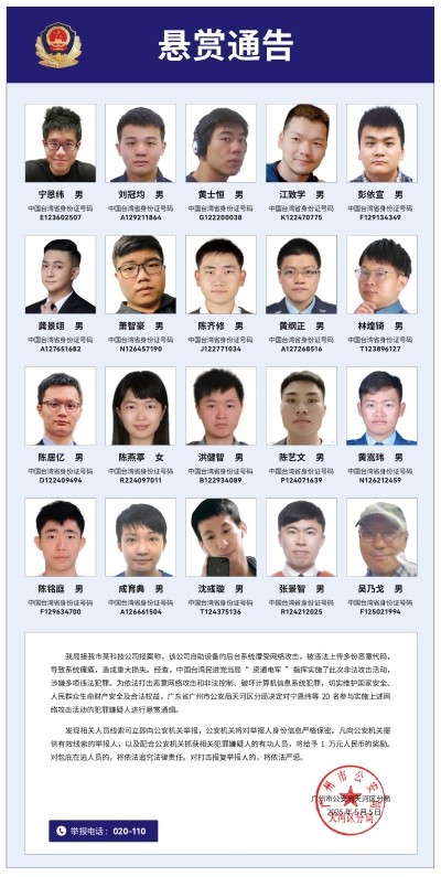 香港中通社資料圖片 昨天(6月5日)上午,中國廣東省廣州市公安局天河區分局對台灣民進黨當局“資通電軍”20名參與實施網絡攻擊活動的重要犯罪嫌疑人進行懸賞通緝。 據悉,這也是大陸政府部門首次通過執法行動對“台獨”分裂勢力亮劍,首次對台灣“資通電軍”有組織網絡違法犯罪行為的集中打擊。 該懸賞令立即引起台灣島內關注和熱議。其中,有台灣媒體注意到,從2024年9月以來,大陸已經三度曝光“資通電軍”成員資料,而且一次比一次更詳盡。 2024年9月,大陸首度公布3名“資通電軍”人員身份信息,包括姓名和照片。 今年3月,大陸再度披露4名“資通電軍”員詳細身份,不僅有姓名、照片、出身日期、身份證號,還有職銜。 而6月5日大陸公布的20名“資通電軍”懸賞通告,除了網軍人員詳細信息外,更明確一萬元人民幣的懸賞獎金。 值得注意的是,前兩次公布的機關為國安部,而這次是大陸地方公安局,措施從“立案偵查”改為“通緝”。同時發布的還有一份長達44頁且含中英版本的對“資通電軍”調查報告。