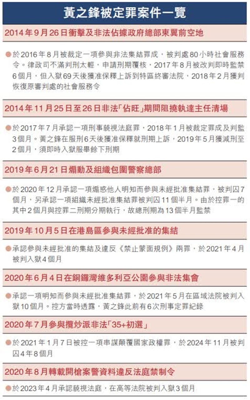 【延伸閱讀】 屢糾黨挑戰法治 7年有9次定罪紀錄 黃之鋒是已解散的反中亂港組織“香港眾志”前秘書長,多年來不斷糾黨挑戰法治,曾被區域法院法官陳廣池形容為積犯,在法庭判刑時被視為加刑因素。黃之鋒自2014年涉衝擊政總前空地,並在2017年被定罪判囚,再到黑暴期間包圍警總,至2024年因干犯香港國安法串謀顛覆國家政權罪被判囚4年8個月,7年間有9次定罪紀錄,部分案件更是在前案保釋期間再犯。在“35+串謀顛覆政權”案中,法官量刑時明言關注黃之鋒之前有多項案底,黃不能將舊案的求情理由循環再用。 在黃之鋒過去被定罪的案件中,大部分涉及非法集結,包括2019年6月21日包圍警總案被控後獲法庭保釋,同年10月5日在《禁止蒙面規例》生效當天又參與遊行,以及違反《禁止蒙面規例》。2020年6月,黃之鋒在維園再干犯未經批准集結罪,區域法院法官陳廣池判刑時指,由於黃之鋒過去有多次相關刑事定罪紀錄,是一名積犯,故判處較高的10個月監禁。黃之鋒因6·21包圍警總、10·5非法遊行和維園非法集會案,分別被判監禁13.5個月、4個月及10個月,總刑期為27.5個月。其間,黃之鋒就刑期上訴,上訴庭批准黃的申請,將10個月監禁下調至8個月,並下令其中6個月與6·21包圍警總和10·5非法遊行案的刑期分期執行,換言之,黃的總刑期為23.5個月,但黃之鋒另涉“35+串謀顛覆政權”案被還押候訊。 在“35+串謀顛覆政權”案的審訊中,3名國安法指定法官關注到黃之鋒有多項案底。在這些案件中,有部分是黃之鋒在獲法庭保釋期間干犯。辯方接受此屬加刑因素,但稱黃承認有關控罪,希望法庭判刑時考慮整體量刑原則,酌情扣減部分刑期。辯方承認案情指,黃之鋒曾主張“國際線”,並到美國游說尋求外國支持等,但辯稱與本案控罪無關。 法官陳仲衡指,不能將黃視作有良好品格,因為他有案底,且相關求情因素已被其他法官考慮,故不能循環再用。法官李運騰亦質疑,法庭在黃之鋒早前的案件量刑時已考慮到這些因素,不能因此而給予額外扣減,最終判處黃之鋒監禁4年8個月。(來源:香港文匯報 記者:葛婷) 【編輯:豐悅】