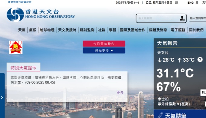 1、香港天文台9日清晨6時間45分發佈特別天氣提示,指出高溫天氣持續!請補充足夠水分。如感不適,立刻休息或求助,需要時儘快求醫。