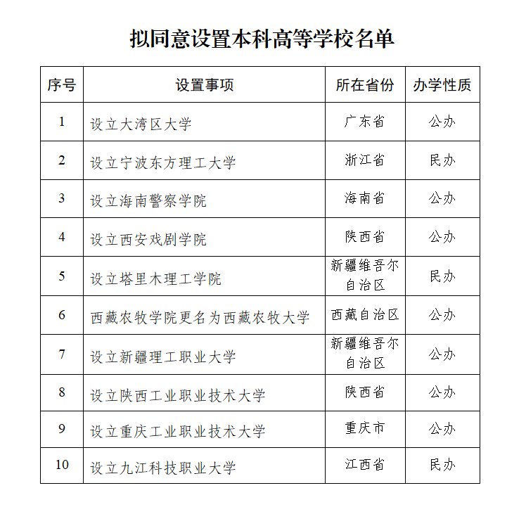 圖源:中國教育部網站 公示信息顯示,10所高校中,5所為新設院校,1所為普通本科高校更名,4所為職業本科大學。公示時間為2025年6月11日至6月17日。