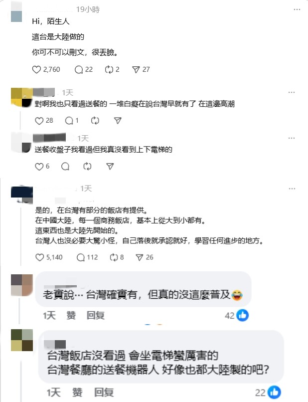 對此,眾多台灣網友忍俊不禁。有網友提醒青鳥,“不好意思,這是大陸製造的。”“這台是大陸做的。你可不可以删文,很丟臉。”有網友諷刺青鳥,“拿大陸研發製造的產品,說是台灣的,果然詐騙島無誤。”“難道是在為‘大陸製’打廣告?” 不少台灣網友表示,看到“會按電梯”的送餐機器人確實“蠻新奇”:“見過送餐機器人,會按電梯的確實少見。”“台灣確實有(送餐機器人),但是沒有這麼普及。”“承認自己的不足沒什麼,學習別人先進的地方。” 還有網友認為“館長”是在“反串”,諷刺青鳥此前一直造謠大陸“很落後”。