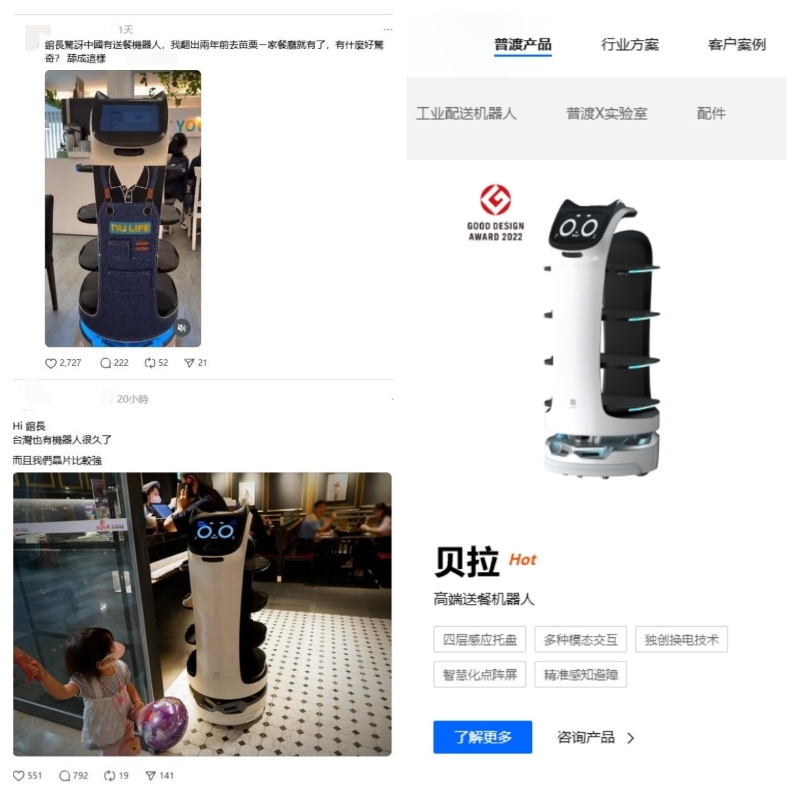 圖為機器人送餐時的畫面。圖源:台灣“中天新聞” 6月11日晚,在夜遊黃浦江後,“館長”一行人回到酒店,拿起手機點外賣。稍後,送餐機器人將外賣送到門口,“館長”對此感到新奇,忍不住感慨“看一下大陸現在做到什麼地步”,“這個台灣有嗎”。鏡頭還跟隨送餐機器人到電梯口,見證機器人“自己按電梯送餐”的一幕。 這原本是個有趣的小插曲,台灣有些人卻看得“心裡不舒服”。 一些青鳥在社交平台上發文稱,“台灣早就有機器人”“有什麼好驚奇的”“舔陸”“丟臉”。一些親綠媒體則報道稱,有位博主在2018年拍攝的視頻裡就顯示,台灣早就有飯店應用同樣的服務。 然而大家仔細一看,卻發現這些綠營側翼網軍、媒體所舉的例子,大多都是“大陸製”。 比如,很多青鳥所說的“貓咪送餐機器人”,實際上是深圳市普渡科技有限公司開發的產品“BellaBot”,由甲電國際、禾煜科技等台灣企業代理銷售、進行本地化服務。至於綠媒所提到的,油管博主Joeman“穿越打臉館長”的視頻裡的送餐機器人,則是北京雲跡科技股份有限公司研發的產品。