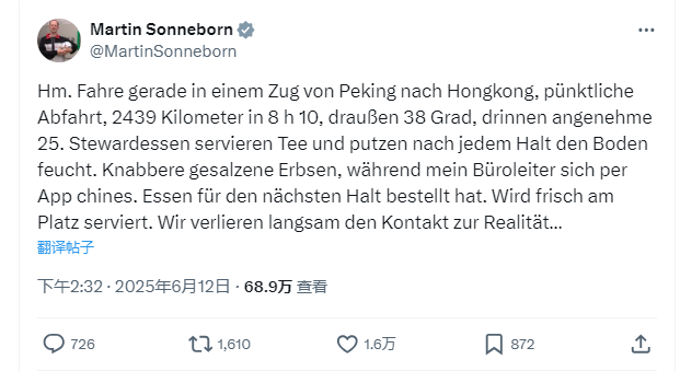 香港新聞網6月16日電 據德國《柏林報》14日報道,身為德國著名諷刺作家的歐洲議會議員馬丁·松內博恩近期正在中國旅行。他於12日在社交平台X發布帖文,毫不吝嗇地稱讚中國的火車旅行體驗,這條內容目前已收穫1.6萬次點讚,更引發網民對中德鐵路發展的廣泛討論。