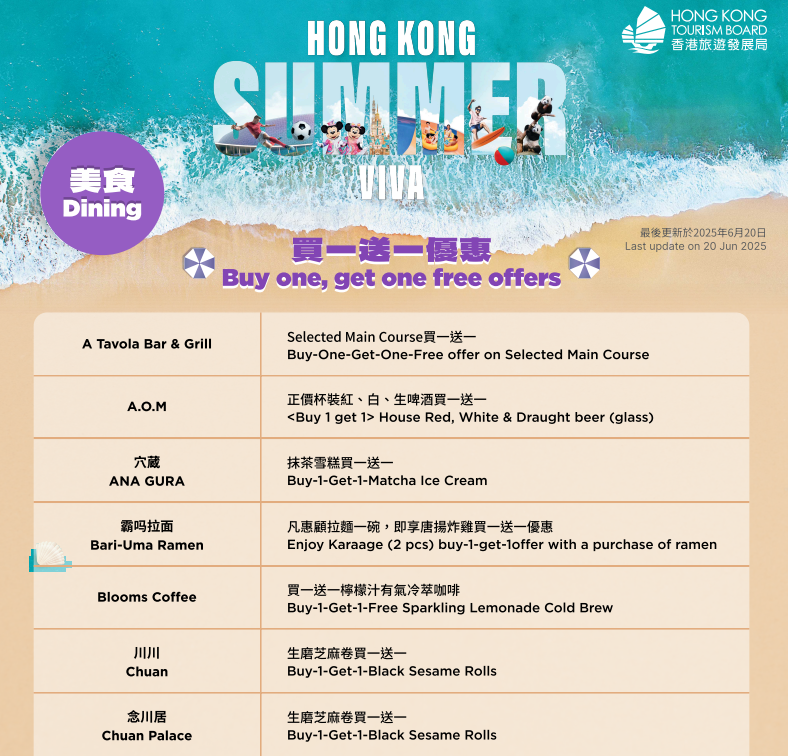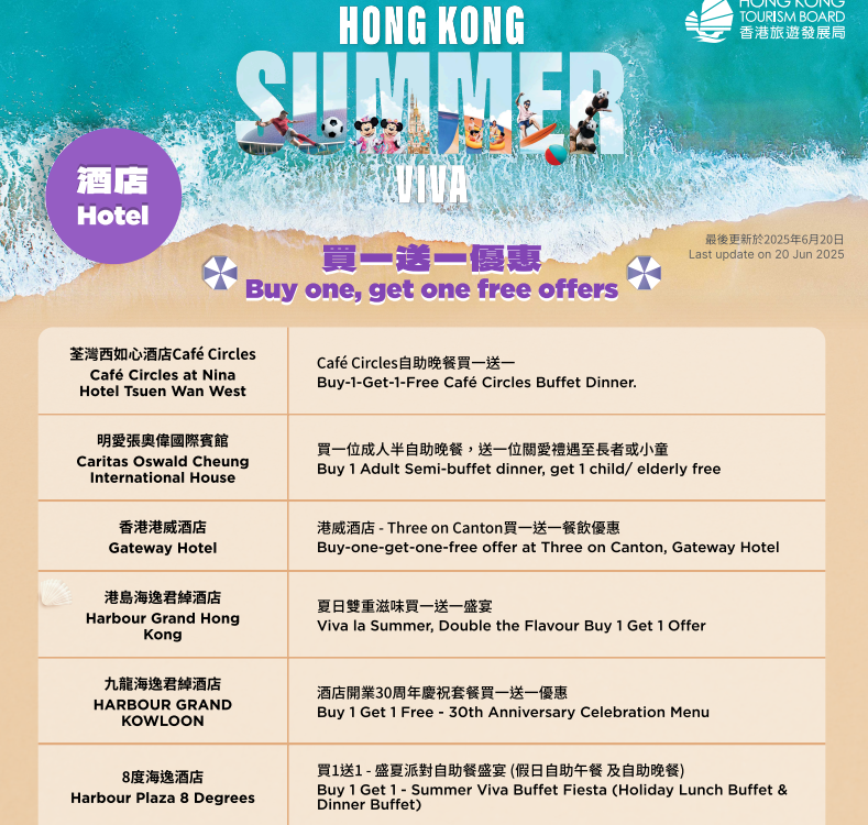 部分買一送一優惠。 旅客及市民可於6月23日中午12時起,透過旅發局“香港盛夏派對”指定專頁內領取或選擇禮遇及消費優惠,名額有限,先到先得。 旅客專享方面,包括香港迪士尼樂園的免費提早入園證、明信片換領等,亦有香港海洋公園將於7月5日至8月31日向入場旅客送贈的“盛夏派對禮包”。此外,還有港鐵機場快線成人單程票買一送一、山頂纜車免費來回車票達凌霄閣摩天台428入場套票、香港水上的士維港遊43折等。