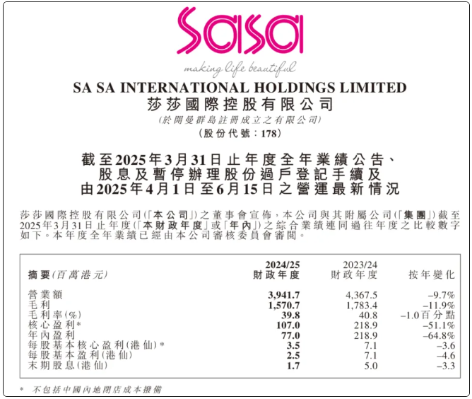 莎莎財報。 根據財報,截至2025年5月31日,莎莎國際已關閉9間店鋪,其餘9間店鋪預期將於6月30日前全部關閉。從財報數據看,目前莎莎國際在內地市場則呈現“線上強、線下弱”的分化格局。2024/25財年營業額同比下降10.5%至5.21億港元,其中線上渠道占比80.3%,為4.18億港元;線下渠道占比19.7%,為1.03億港元。 電商業務超八成專攻線上渠道 隨著以電商為代表的零售新業態飛速發展,加之各類新型集合店的湧現,以及疫情等因素,莎莎國際近些年業績也承壓。在行業競爭激烈的環境下,這家公司如今開始重新調整其戰略布局。 莎莎國際在財報中提到,公司正通過社交媒體營銷、直播帶貨及微信小程序等數字化工具加強與消費者的互動,但面對本土美妝品牌和跨境電商的衝擊,其線上增長空間仍面臨挑戰。莎莎國際表示,此舉旨在“優化資源配置,降低運營成本”,并計劃將資源集中於線上渠道及港澳、東南亞等核心市場。 儘管線下業務萎縮,莎莎國際在中國內地的線上渠道仍展現出一定韌性。2024/25財年,內地線上營業額微增0.6%至4.18億港元,佔地區總營業額的80.3%,并占集團總線上營業額的58.4%。然而,這一增速較上一財年顯著放緩,反映出線上競爭的加劇。 相比之下,莎莎國際在港澳及東南亞市場的表現更為穩健。2024/25財年,港澳市場營業額同比微跌8.1%至28.1億港元,但跌幅較上半年顯著收窄;東南亞市場則錄得12.9%的線上銷售增長,線下業務亦保持增長態勢。公司表示,隨著港澳旅客量回升及東南亞電商滲透率的提升,未來將進一步加大在這些市場的投入。 對於內地閉店的原因,莎莎國際解釋稱,由於線上業務占當地營業額超80%,同時愈來愈多顧客傾向網上購物,加上目前的線下店鋪數目,無法達到規模經濟的效益。公司接下來集中資源專注發展線上業務,加強在熱門社交媒體平台及數碼渠道的宣傳力度,提升獨家品牌的曝光率及競爭力。 莎莎國際表示已預留3000萬港元專項閉店成本,用於支付員工遣散、門店賠償及存貨處理等費用。 (完) 【編輯:錢林霞】