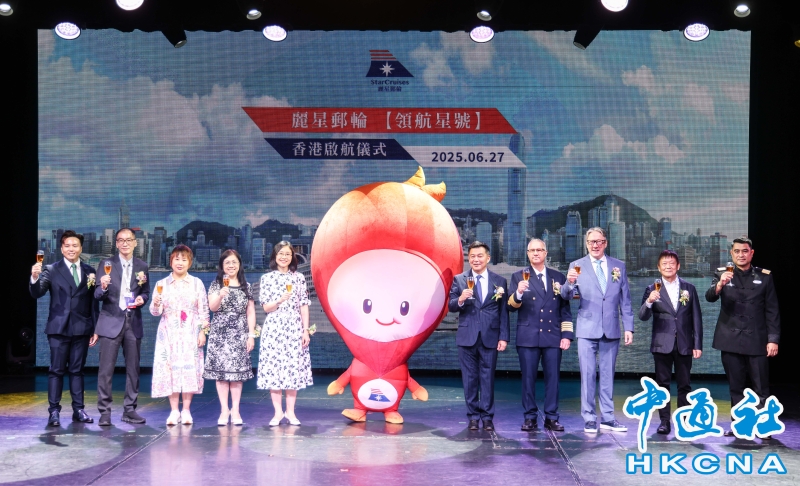 6月27日,全新升級的麗星郵輪旗下“領航星號”正式抵達香港, 以這個國際級郵輪樞紐為母港,開啟2025年郵輪航季。即日起至 11月14日,“領航星號”將以位於市中心的海港城海運碼頭為母港,推出45個往返航次,提供2晚、3晚及5晚的行程,帶領旅客探索東亞及東北亞最具魅力的旅遊目的地。圖為首航儀式。(香港中通社記者 曹文毓攝) 香港中通社圖片