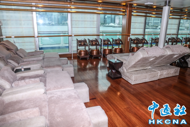 6月27日,全新升級的麗星郵輪旗下“領航星號”正式抵達香港, 以這個國際級郵輪樞紐為母港,開啟2025年郵輪航季。旅客可入住客房或升級皇宮套房,體驗船上多元設施,包括探索樂園、攀岩牆、高空滑索以及各類現場表演。同時,郵輪上亦會舉辦國際級娛樂活動,包括紅毯之夜、季節主題及泡泡狂歡派對等,並提供健身室、桑拿房、娛樂場以及兒童俱樂部,滿足不同年齡段旅客的需求。圖為桑拿房。(香港中通社記者 曹文毓攝) 香港中通社圖片