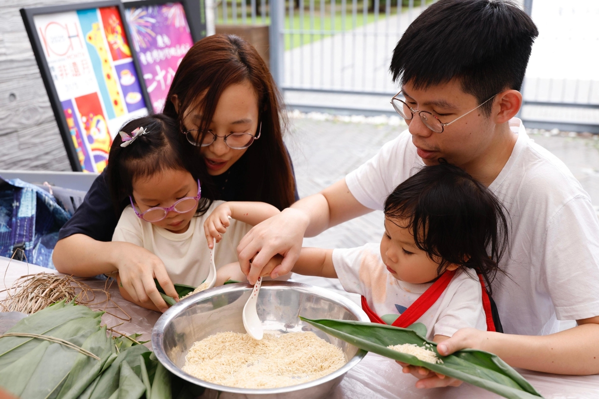 圖為市民製作灰水糭 除香港市民熟悉的本地傳統食品外,現場還有國家級非遺代表性項目江西贛南客家擂茶製作技藝的示範及體驗,供市民參與。