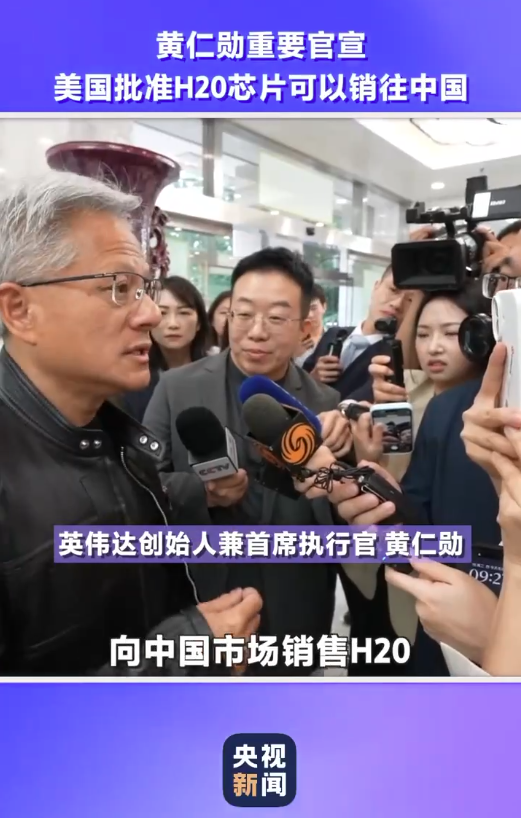 央視新聞視頻截圖 據央視新聞15日報道,黃仁勳當天在接受總台央視記者採訪時宣布兩個重要進展:美國已批准H20芯片銷往中國、英偉達將推出RTX Pro GPU。 黃仁勳表示,美國政府已經批准了英偉達的出口許可,公司可以開始發貨,並將開始向中國市場銷售H20芯片。黃仁勳說,非常期待能很快發貨,並對此感到非常高興,形容“這真是個非常、非常好的消息”。 他還透露,英偉達將發布一款名為RTX Pro的新顯卡。這款顯卡非常重要,是專為計算機圖形、數字孿生和人工智能設計的。 另據報道,黃仁勛在接受採訪時,特別強調了中國市場的重要性。他指出,中國市場龐大且充滿活力,人工智能發展極為迅速,全球約50%的人工智能研究人員都在中國。這一獨特優勢,使得美國企業扎根中國市場成為關鍵之舉。 黃仁勛提到,來華前與美國總統特朗普會面,“他知道我這次要來中國,也知道我將在鏈博會上發言,他祝我在中國旅途愉快。” H20,是英偉達為遵守美國出口限制而推出,專為中國市場設計的AI加速器。今年4月,美國政府決定禁止英偉達向中國市場銷售其H20芯片。當時黃仁勳曾表示,這一禁令預計讓公司損失150億美元的銷售額。 據中國貿促會消息,黃仁勳將於7月16日出席第三屆鏈博會開幕式,並參加相關活動。這也是黃仁勳今年年內第三次來華。 今年1月,黃仁勳曾進行過為期約一周的中國之行,先後現身深圳、北京、上海等地,出席公司年會、與員工共舞,還向員工發放紅包,展現了對中國團隊的重視。4月17日,中國貿促會會長任鴻斌在北京與黃仁勳舉行會談。黃仁勳在會談中表示,中國是英偉達非常重要的市場,希望將繼續與中國合作。 7月14日,黃仁勳與小米集團創始人、董事長兼CEO雷軍的兩張在北京的合影在互聯網流出。在兩張照片中,黃仁勳身穿標誌性的皮衣,而當天北京的氣溫高達35度。其中一張照片顯示二人站在一處中式古建築前,充滿笑意;另一張照片中,二人站在一輛小米汽車旁,對著鏡頭比出大拇指。有媒體就此向英偉達方面求證,對方回應照片非其發布,“具體情況不清楚”。另有知情人士表示,照片是路人拍攝的,與雷軍會面是拜訪客戶,屬於非公開行程,但具體拍攝時間並未對外透露。(完) 【編輯:石歡歡】