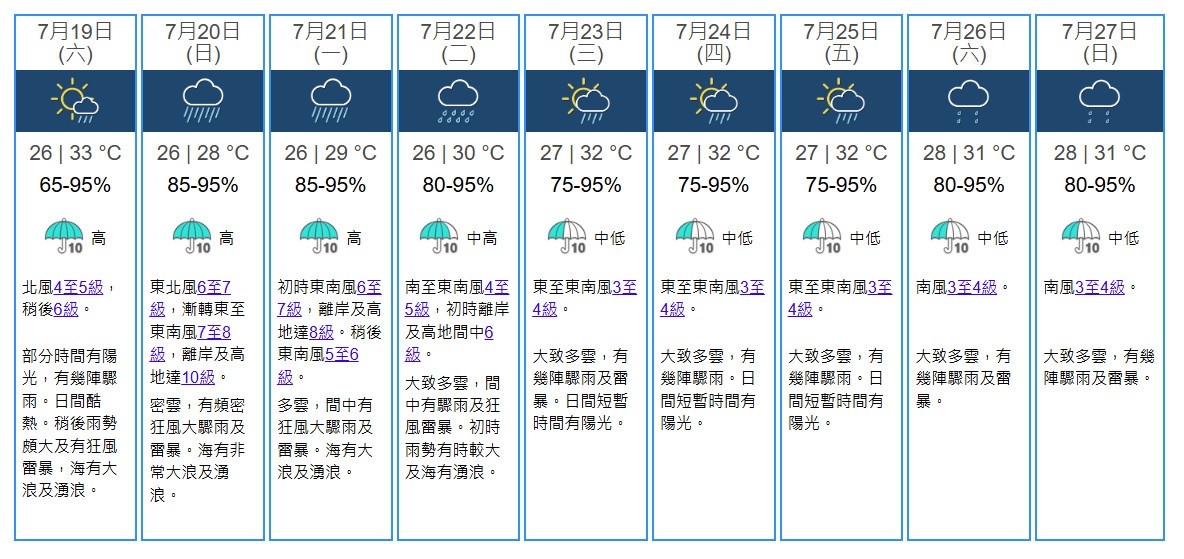 未來9天天氣預報。香港天文台官網截圖 【政府新聞公報19日發佈的部分停工停學通知】 *由於香港天文台會在今日(19日)下午2時至3時改發三號熱帶氣旋警告信號,幼稚園(包括幼稚園的下午班及全日班)、肢體傷殘兒童學校及智障兒童學校今日中午後將停課。但上述學校須保持校舍開放,同時實施應變措施,照顧已返抵學校的學生,並在安全的情況下,方可安排學生返家。 *香港土木工程拓展署今日(19日)宣布,因天文台發出一號戒備信號,柴灣公眾填土躉船轉運站已於上午8時30分停止開放,直至另行通知。 *香港國際貨櫃碼頭有限公司宣布,由於強烈熱帶風暴韋帕接近本港,四、六、七及九號貨櫃碼頭、中遠國際、亞洲貨櫃,中午12時起停止所有吉櫃交收,其他服務正常操作。 *香港旅遊事務署宣布:由於香港天文台會在今日(19日)下午發出三號強風信號,今晚上演的“幻彩詠香江”已告取消。 【編輯:豐悅】