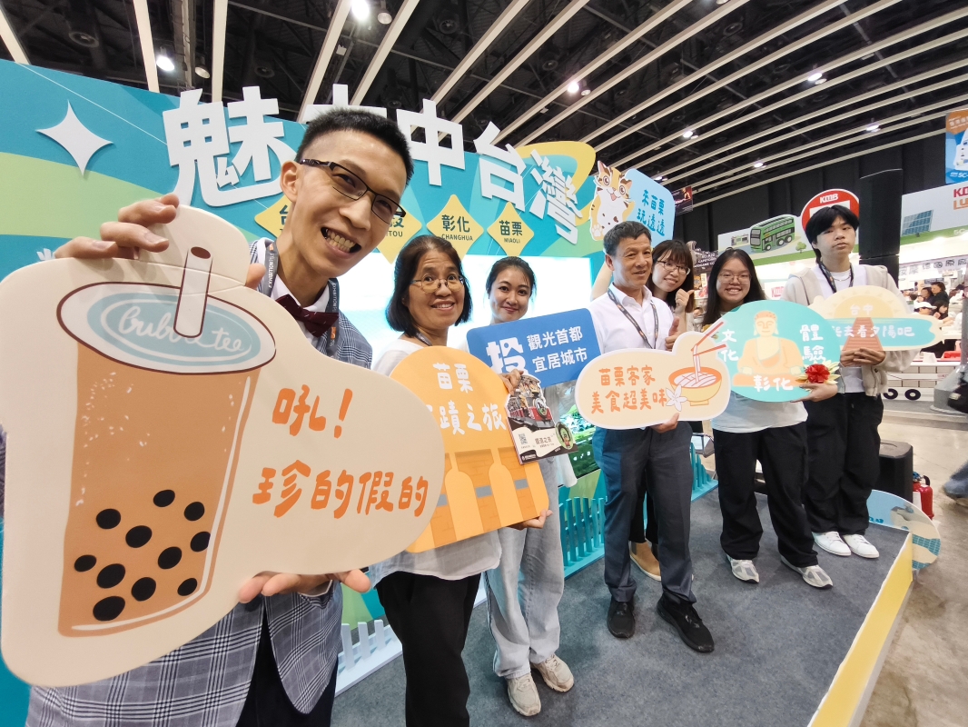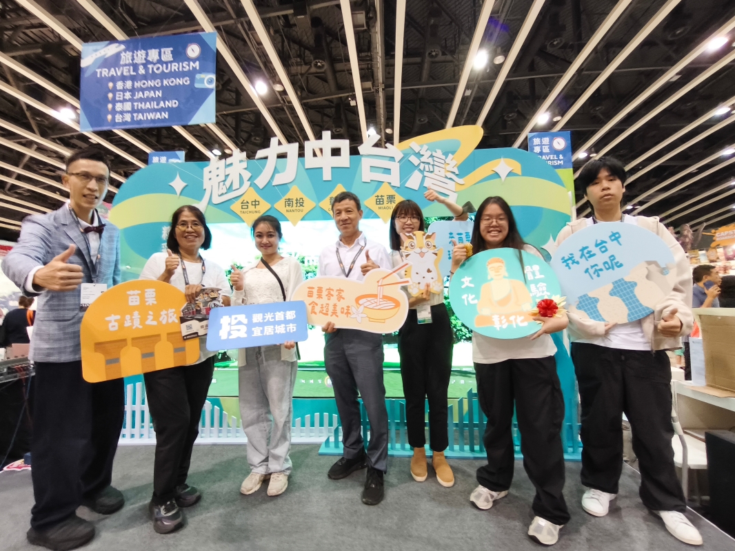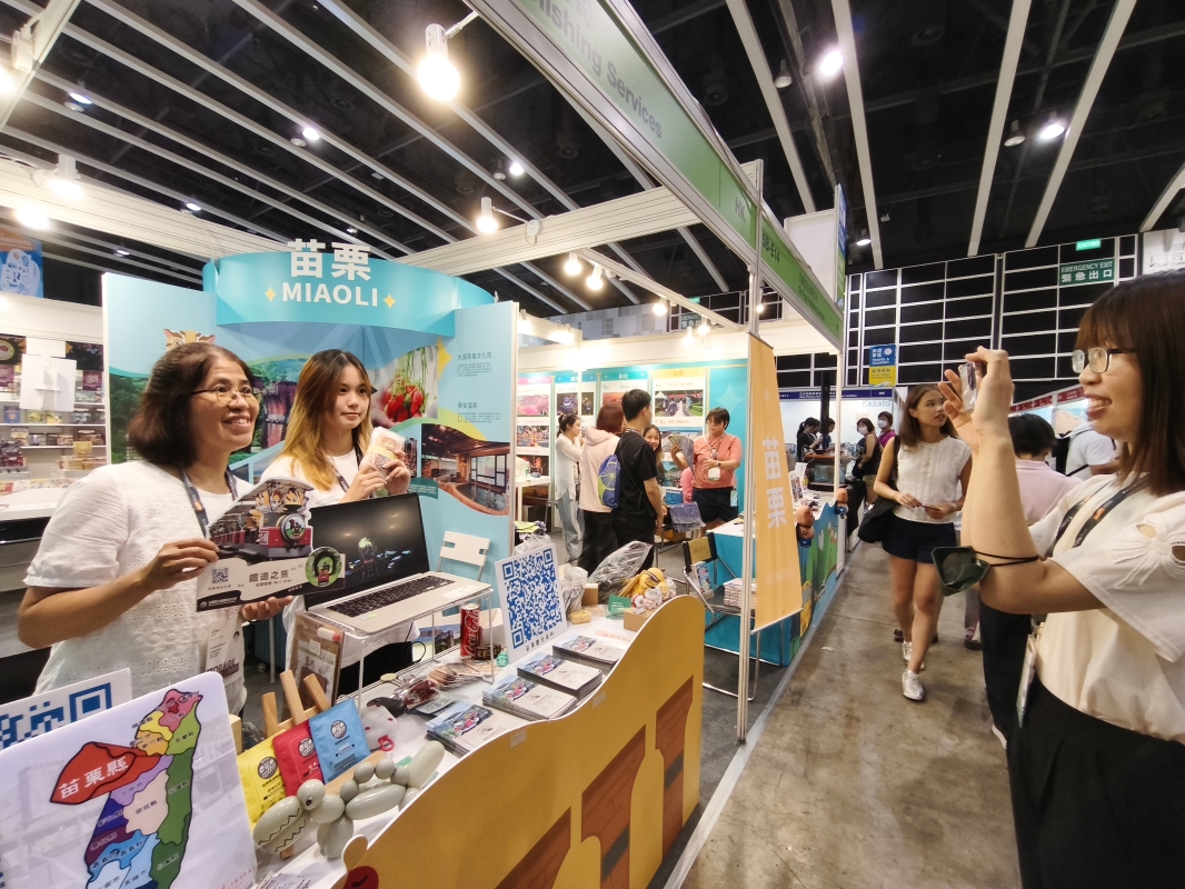 苗栗縣政府科長徐春良(中)、多利多國際食品公司行銷長吳坤泰(左)、苗栗縣舊鐵道自行車公司香港業務代表朱美好(左二)等在推介各自特色文旅產品。