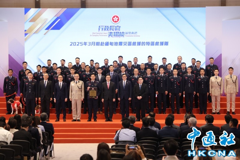 7月23日,香港特區行政長官李家超主持“行政長官表揚榜”頒獎典禮。香港中通社圖片 “行政長官表揚榜”自2023年推出,今年頒發榮譽予“2025年3月前赴緬甸地震災區救援的特區救援隊”和“啟德體育園開幕跨部門籌備專組”。