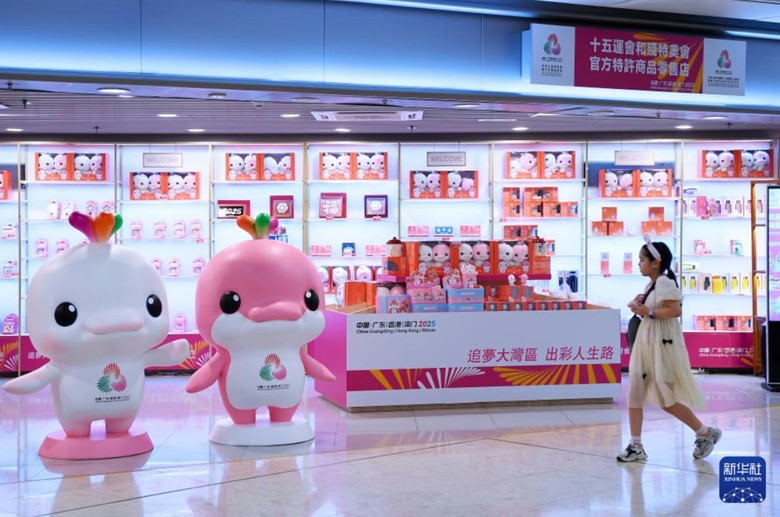 7月14日,一名女孩從香港西九龍站官方零售店前走過。當日,第十五屆全國運動會香港賽區官方特許商品開始發售。新華社圖