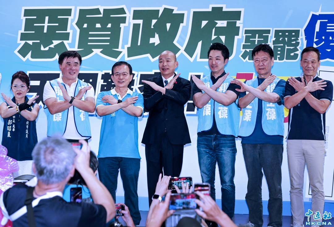 台灣“大罷免”投票日將至,台北凱達格蘭大道再成“兵家必爭之地”。民進黨24日在此地舉辦造勢大會,中國國民黨25日預計舉辦“選前之夜”活動,多位藍營市長及知名政治人物出席,台灣民眾黨主席黃國昌等白營政治人物也會到場助陣,呼籲民眾投下不同意罷免票。圖為國民黨立法院長韓國瑜(左四)、台北市長蒋萬安(右三)、名嘴趙少康(右二)等人呼籲民眾投下不同意票。 香港中通社圖片