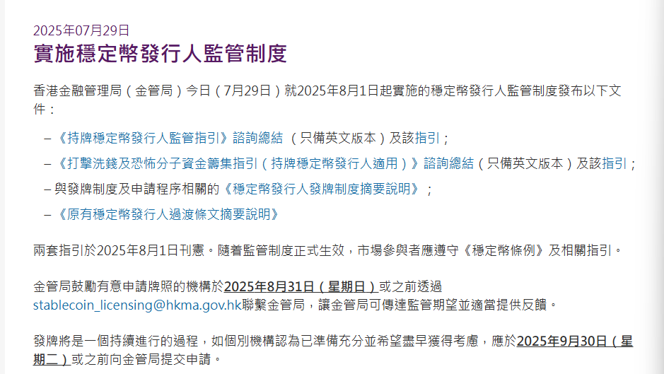 香港金管局發佈穩定幣發行人申請指引香港新聞網7月30日電 香港金融管理局發佈持牌穩定幣發行人監管制度系列指引(簡稱“指引”),提出法定穩定幣的定義,明確發行人牌照申請的財務條件、人員資質、儲備資產、風險管理和監管要求等。香港金管局表示,截至7月29日,香港金管局尚未發出任何牌照,并鼓勵有意申請牌照的機構於2025年8月31日或之前聯繫金管局。 指引將於2025年8月1日刊憲 香港金融管理局就2025年8月1日起實施的穩定幣發行人監管制度發布文件,分別是《持牌穩定幣發行人監管指引》諮詢總結 (只備英文版本)及該指引;《打擊洗錢及恐怖分子資金籌集指引(持牌穩定幣發行人適用)》諮詢總結(只備英文版本)及該指引;與發牌制度及申請程序相關的《穩定幣發行人發牌制度摘要說明》;《原有穩定幣發行人過渡條文摘要說明》。兩套指引於2025年8月1日刊憲。隨著監管制度正式生效,市場參與者應遵守《穩定幣條例》及相關指引。