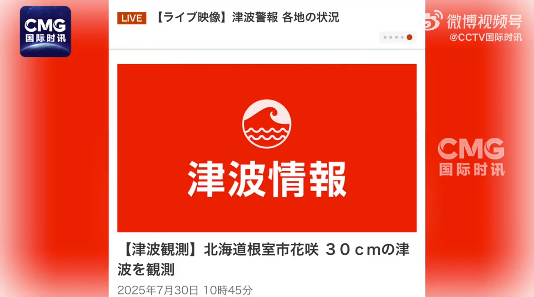 日本北海道根室市確認第一波海嘯到達(圖源:CCTV國際時訊微博) 日本北海道根室市錄30厘米高海嘯 據日本氣象廳消息,當地時間7月30日上午10點17分左右,北海道根室市已確認到第一波海嘯到達,觀測當地最大海嘯高度約為30厘米左右。 稍早前,日本氣象廳升級海嘯預警。日本氣象廳稱,受堪察加半島附近發生強烈地震的影響,預計部分地區將出現最高3米的海浪,請“高度警惕”。 日本全國17個地區已發布海嘯預警,包括北海道太平洋沿岸東部、北海道太平洋沿岸中部、北海道太平洋沿岸西部、青森縣太平洋沿岸、岩手縣、宮城縣、福島縣、茨城縣、千葉縣九十九里與外房、干葉縣內房、伊豆諸島、小笠原諸島、相模灣及三浦半島、靜岡縣、愛知縣外海、三重縣南部、和歌山縣。自北至南預計到達時間為當地時間上午10時至11時30分。當地政府呼籲民眾遠離海岸和河流,盡快避難。日本仙台機場因海嘯預警關閉。 東京電力公司30日發布消息稱,受海嘯相關影響,已於當地時間9時5分左右暫停福島第一核電站核污染水排海。8時51分,東京電力公司對福島第一核電站內員工發出避難指示,並稱將關注海嘯信息,監測海嘯是否會對核電站產生影響。 中國駐日本福岡總領事館發布緊急提醒:據日本氣象部門消息,受堪察加半島附近強震影響,預計海嘯將於今日12時30分起到達宮崎縣、大分縣、鹿兒島縣、沖繩縣沿岸。總領館提醒上述四縣(含離島)沿海地區的中國同胞密切關注海嘯預警和防災信息,立刻遠離海邊、港口和河口區域前往高處,做好防災、應急避難等準備,確保人身安全。 菲律賓發布海嘯預警 當地時間7月30日,受堪察加半島附近發生強烈地震的影響,菲律賓火山地震研究所發布海嘯預警。預警稱,本次強震將引發菲律賓沿岸地區輕微的海面擾動,預計海嘯浪高將小於1米。首批海嘯波浪預計於當地時間30日13時20分至14時40分抵達。 菲律賓火山地震研究所建議該國北部到南部的20餘個省份的民眾遠離海灘,並留意異常海浪。 加拿大不列顛哥倫比亞省大部分地區發布海嘯預警 在堪察加半島附近發生地震後,加拿大西海岸的不列顛哥倫比亞省大部分地區發佈海嘯預警,建議民眾“保持警惕以獲取更多信息”。 堪察加半島是俄羅斯第二大半島,位於俄羅斯遠東地區,西瀕鄂霍次克海,東臨太平洋和白令海。半島上人煙稀少。本月20日,堪察加半島附近海域接連發生6.7級、7.4級和6.7級地震,並引發海嘯預警。22日這一地區發生6.3級地震,震源深度10公里。(綜合香港中通社、央視新聞、CCTV國際時訊、中國地震台網) 【編輯:石歡歡】