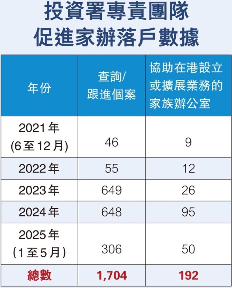 (圖)投資署專責團隊促進家辦落戶數據。 許正宇表示,據專責團隊及家辦業界所理解,有意或已在港設立家辦的人士,普遍關注的範疇包括相關合規要求、稅務優惠及專業人才供應等。 因應業界所提意見,並為加強“新資本投資者入境計劃”與在港設立家辦兩者之間帶來的協同效應,政府已於今年3月1日起實施優化措施,包括容許申請人透過由相關《稅務條例》所界定的具資格單一家辦管理,並由申請人全資擁有的合資格私人公司,進行“新資本投資者入境計劃”下的投資,將計入合資格投資金額內。 同時,政府亦致力壯大財富管理及家辦人才庫,以滿足家辦對專業人才的需求。自2016年起,當局推行提升資產財富管理業人才培訓先導計劃,以培養更多業界人才。該計劃至今有逾4,800宗合資格專業培訓課程的學費資助申請獲批,並為超過1,100名大專學生提供實習機會,支持業界提供更多專業培訓及學習機會,提升從業員的專業水平。 審慎研究聯闔家辦優惠稅制政策 另外,港府已在2025至2026財政年度的《財政預算案》,公佈進一步優化單一家辦的優惠稅制的建議,包括增加單一家辦享有稅務寬減的合資格交易種類,例如碳排放衍生工具/排放限額、保險相連證券、貸款及私募債權投資和數碼資產的交易等,以吸引更多家辦來港落戶。政府目標是在今年內制訂具體方案,並於明年提交立法會審議。 有議員提問會否將該優惠稅制的涵蓋範圍擴大至聯闔家族辦公室:許正宇回應說,現時的家辦優惠稅制,並不包括聯闔家辦所管理的家控工具,原因是聯闔家辦一般屬獨立的服務提供者,並非由有關家族所擁有。聯闔家辦或會為第三方提供投資管理服務或其他金融服務,實際上與銀行、私人銀行及資產及財富管理公司的業務無異。再者,如不同家族的家控工具由聯闔家辦管理,亦難以確定相關家控工具是否符合最低資產門檻和實質活動要求。因此,當局將審慎研究將稅務優惠進一步擴大至聯闔家辦的實際效益及對財政的影響。 港資管業去年淨資金流入飆升81%至7050億 香港證監會主席黃天祐昨日(30日)在中資基金業協會活動上表示,本港的資產管理業在去年交出了亮眼成績單,波士頓諮詢公司(BCG)最新的報告顯示,香港已與瑞士並列為全球兩大跨境財富管理中心。 他指出,香港證監會早前發布的《2024 年資產及財富管理活動調查》顯示,全行業管理資產總值達35.14萬億元,年增率13%;淨資金流入更飆升81%至7,050億元,其中資產管理及基金顧問業務的淨流入,也大幅增長571%,達3,210億元。連同波士頓諮詢公司的最新報告,不僅是行業蓬勃發展的見證,更是香港作為國際金融樞紐實力的生動註腳。 中資基金管理資產增15%至3萬億元 黃天祐表示,中資基金在這波發展浪潮中表現矚目,例如管理資產規模同比增長15%至3.08萬億元,已連續5年跑贏行業平均水平。近兩年,中資基金積極響應香港證監會戰略部署,通過交易所買賣基金(ETF)推動沙特與香港市場的合作,率先推出亞洲首批虛擬資產現貨ETF,以及代幣化零售貨幣市場基金,為行業創新發展注入強勁動能,實在值得表揚。 不過,他表示,目前中資基金在香港基金市場僅佔9%,與內地企業佔港股市值80%、南向資金佔成交23%的格局相比,仍有廣闊的提升空間。此外,中資基金當前的投資者結構仍以香港和內地為主。對此,香港證監會鼓勵中資資管機構,堅持創新驅動與多元化發展,持續拓展投資者來源,提升全球化資產配置能力;同時緊抓基金互認安排、ETF通、大灣區“跨境理財通2.0”等市場聯通機制所帶來的戰略機遇。