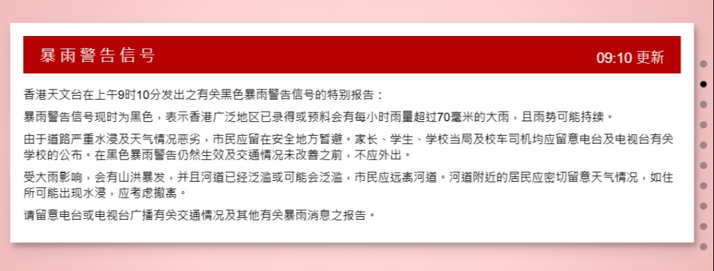 土瓜灣一條道路發生水浸導致一輛的士熄火。(記者 許其皓摄) 5日上午5時50分,香港天文台發出黑色暴雨警告信號,隨後在上午預告黑雨信號至少維持至下午3時。這次黑雨距離4日深夜發出的黑雨警告信號不到6小時。此前的數日,天文台已先後於7月29日、8月2日發出黑雨。 香港現行的暴雨警告信號分為三級,從輕到重依次為黃色、紅色和黑色。 翻查天文台資料,過往發出黑雨次數最多的年份是2000年及2006年,均為3次。而今年至今已發出4次,且密集出現在短短8日內,可見惡劣天氣頻發程度。 據天文台介紹,近日的暴雨是因為季風渦旋逐漸北抬,其南面的活躍西南季候風在過去的周末期間開始影響華南沿岸。大氣低層的西南急流會為該區輸送源源不絕的水汽,加上大氣中層的高空擾動靠近,再配合強勁的高層輻散,大氣條件有利對流在相關區域發展,帶來大驟雨及狂風雷暴。 天文台前台長林超英在社交網站發文解釋持續暴雨因“列車效應”,指雨團像火車一卡緊跟一卡,在西南季風背景下,向著東北偏東方向走,絡繹不絕。 暴雨期間,香港多處發生嚴重水浸,其中,將軍澳一處停車場多輛汽車被水沒過車輪,渠務署緊急應變隊伍到場處理,並出動強力排水機械人“龍吸水”協助。 民政事務總署在各區開放臨時庇護中心,義工提供協助。民政事務總署緊急事故協調中心由5日凌晨開始運作,迅速跟進各項緊急事故報告。嚴重水浸的多個地區,區議員和關愛隊密切留意情況並轉介相關部門跟進,黑雨期間暫時未有居民需要轉移。 港鐵宣佈,受惡劣天氣影響,深水埗、彩虹、黃大仙、灣仔等車站有出入口封閉;九龍巴士公司表示,受沿線道路嚴重水浸或山泥傾瀉影響,多條西貢區路線暫停;主要行駛香港島多條路線的城巴,部分路線改道行駛,多條路線維持有限度服務。 醫院管理局宣佈,瑪麗醫院範圍內部分道路出現嚴重水浸,急症室服務受影響。衛生署宣佈,由於黑色暴雨警告信號現正生效,除美沙酮診所外,所有衛生署診所服務將會停止。 華南地區連日來暴雨持續,與香港鄰近的深圳市氣象台5日也對全市發布暴雨紅色預警,進入暴雨緊急防禦狀態。(完) 【編輯:錢林霞】