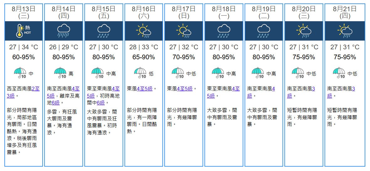 香港地區未來九天天氣預報。香港天文台網頁截圖 由於楊柳移動速度較快,按照現時預測路徑,楊柳將於晚間在福建南部至廣東東部一帶再次登陸,屆時本港離岸及高地風力會逐漸增強,香港天文台會視乎楊柳與珠江口的距離、其強度及本地風力變化,評估是否需要在今晚(8月13日)至明早(8月14日)改發三號強風信號。楊柳會在明日(14日)早上最接近香港。受其雨帶影響,本港明日(14日)會有狂風大驟雨及雷暴。 海有湧浪,市民應遠離岸邊及停止水上活動,並留意天文台的最新天氣消息。 【編輯:豐悅】