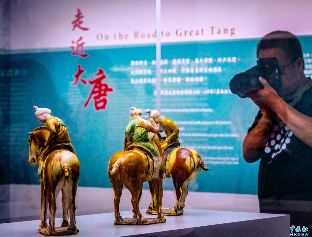 “唐風萬里:多元交融開放的盛世”展覽近日在香港文物探知館舉辦,展覽分為八個單元,多角度呈現大唐多元、交融、開放的盛世時代,展品共展出298件/套,當中包括29件/套屬香港出土的重要唐朝文物。(香港中通社記者 曹文毓攝)