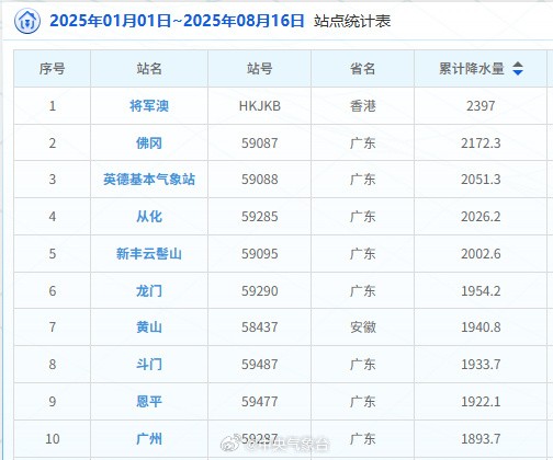 香港新聞網8月19日電 中央氣象台統計了今年以來國家站累計降雨排名,根據排名,今年1月1日至8月16日,香港的將軍澳站憑藉累積降水量達2397毫米,位居排行榜的首位。近期香港為何暴雨頻發?有專家分析指,暴雨因西南氣流、高空擾動、香港地形三因素而成。宏觀來看,因為更暖了,所以大氣能凝結更多水汽。 根據中央氣象台公布,排名第2的為廣東佛岡氣象站,累積降水量2172.3毫米;排名第3的為廣東英德基本氣象站,累積降水量2051.3毫米。至於排名第4到第10位的,分別為廣東從化、廣東新豐雲髻山、廣東龍門、安徽黃山、廣東斗門、廣東恩平,廣東廣州等站點。