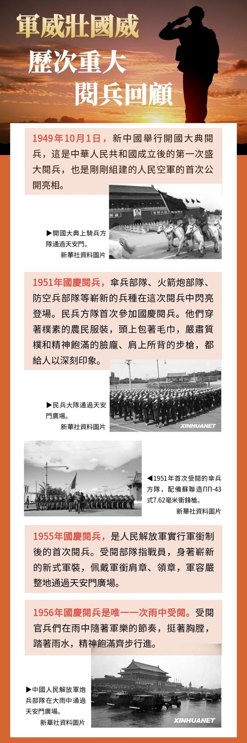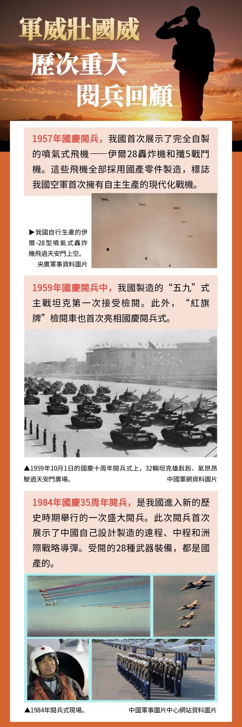 香港新聞網8月21日電 閱兵,是古今中外軍隊的一項極其隆重的軍事儀式,是對軍隊將士的褒獎。在當代世界,閱兵是盡顯武裝力量建設成就、樹立民族自信心和自豪感的一種重要形式。一支軍隊的軍威,一個國家的國威,一個民族的浩然正氣,通過這種閱兵形式可以最直接的展示出來。1949年以來,我國歷次大閱兵見證了新中國軍隊的跨越式發展,展現出了大國擔當,向世界傳遞出了和平的堅定力量。翻看一張張歷史影像,照片從黑白變成彩色,從模糊變得清晰,76年來閱兵場上都上演了哪些令人振奮的時刻?香港新聞網與讀者一同回顧歷次重大閱兵。
