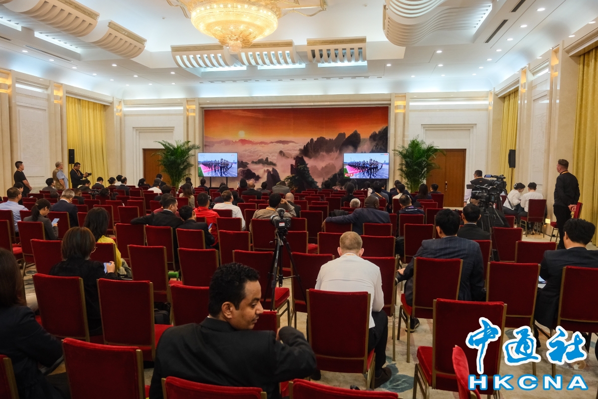 大批中外記者觀看紀念大會電視直播。(香港中通社記者許其皓攝) 【北京時間6:47】 千餘名官兵組成的新中國閱兵史上規模最大的聯合軍樂團,將在人民英雄紀念碑前,演奏大家耳熟能詳的抗戰經典曲目,和大家共同追憶那段艱苦卓絕的抗戰歲月,緬懷那些為民族獨立和自由獻出寶貴生命的英雄先烈。