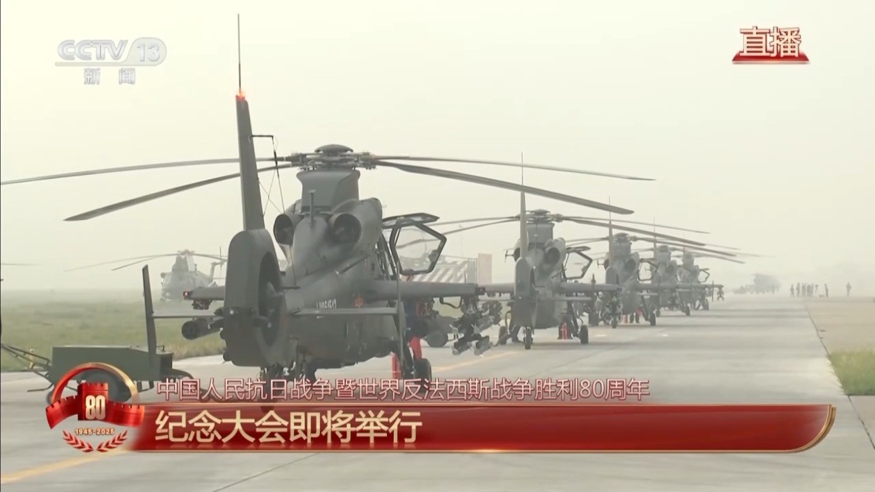 香港新聞網9月3日電 今天是9月3日,中國人民抗日戰爭勝利紀念日。紀念中國人民抗日戰爭暨世界反法西斯戰爭勝利80周年大會將在首都天安門廣場隆重舉行。在閱兵分列式環節,將按空中護旗梯隊、徒步方隊、戰旗方隊、裝備方隊、空中梯隊的順序,依次通過天安門廣場。空中護旗梯隊由多型直升機組成,將以嶄新的隊形,吊掛旗幟和標語,飛過天安門上空,接受祖國和人民的檢閱。現在,這支隊伍的準備情況如何? 央視新聞視頻 央視總台記者王曉丹:這裡是某陸航部隊的機場停機坪。空中護旗梯隊的所有參閱直升機現在準備就緒、整裝待發,將準時從這裡起飛,從東向西,以既定的編組隊形飛向天安門廣場,拉開今天閱兵分列式的序幕。