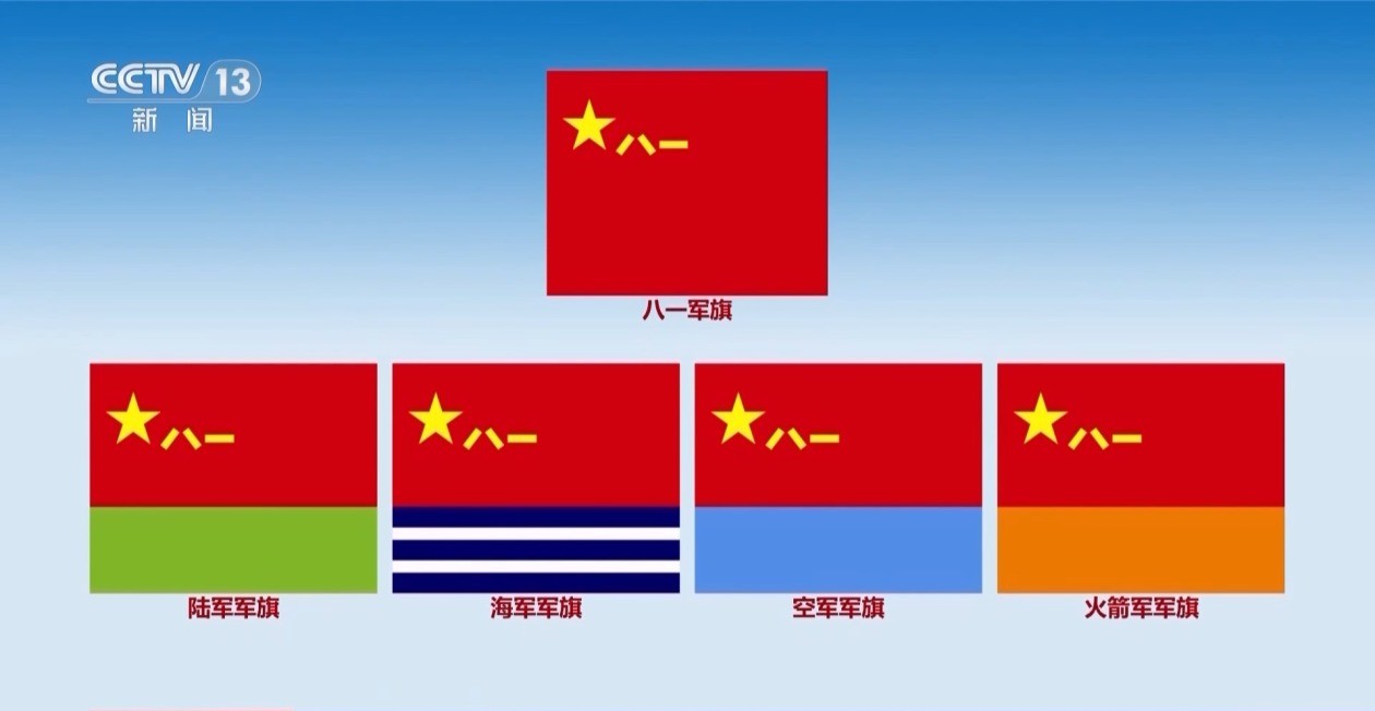 今年7月,中國人民解放軍發佈了軍事航天部隊、網絡空間部隊、信息支援部隊、聯勤保障部隊軍旗旗面式樣。本次閱兵,受閱方隊將擎各自軍旗和武警部隊旗,全方位展示解放軍軍事力量。