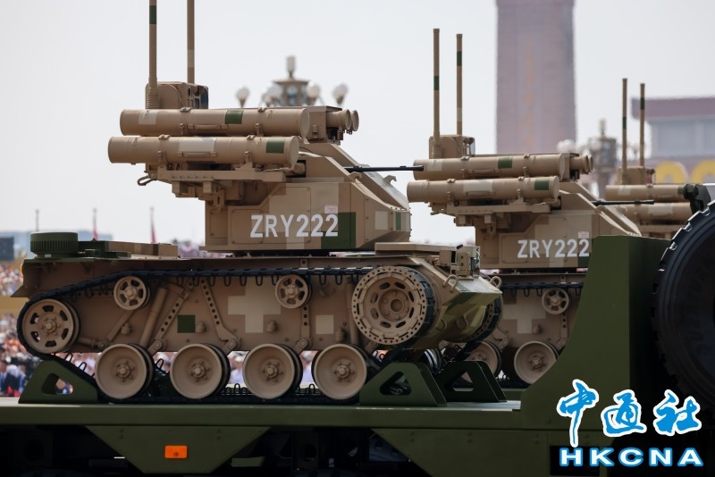 9月3日上午,紀念中國人民抗日戰爭暨世界反法西斯戰爭勝利80周年大會在北京天安門廣場隆重舉行。圖為陸上無人作戰方隊通過天安門廣場,接受祖國和人民檢閱。香港中通社圖片