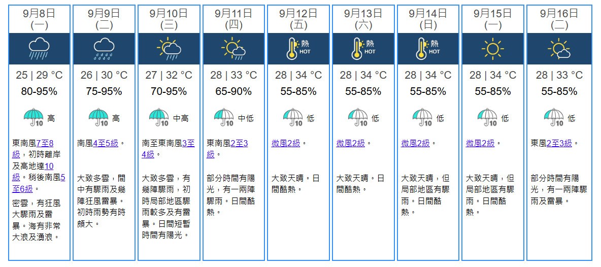 香港地區未來9天天氣預報。香港天文台截圖 部分今晨昇降航班將受影響 香港特區機管局表示,機場7日晚運作大致正常,但今晨(8日)部分航班昇降將會受到影響,抵港航班或會延誤。香港機管局將會啟動航班重新編配機制,協調8日的航班有序昇降。機場將增設臨時休息區,提供500張椅子及手機充電站等設施,並會調派更多人手協助客運大樓內的旅客,向有需要旅客派發基本物資,包括樽裝水、乾糧和毛毯等。為確保機場有足夠人手應付運作及服務旅客,機管局開放兩個員工休息中心,可容納400多名員工。 為接載抵港旅客前往市區,港鐵公司延長今日(8日)凌晨的機場快線服務,增加由機場站開往香港站班次,以配合機場管理局要求,尾班車原定於凌晨12時48分開出,凌晨將加開兩班由機場站開出的班次,分別為1時15分及1時30分。 香港運輸署7日晚表示,運輸署緊急事故交通協調中心在熱帶氣旋襲港期間會繼續24小時運作,並已提升緊急事故交通協調中心的運作級別,加強與公共運輸服務營辦商聯繫。