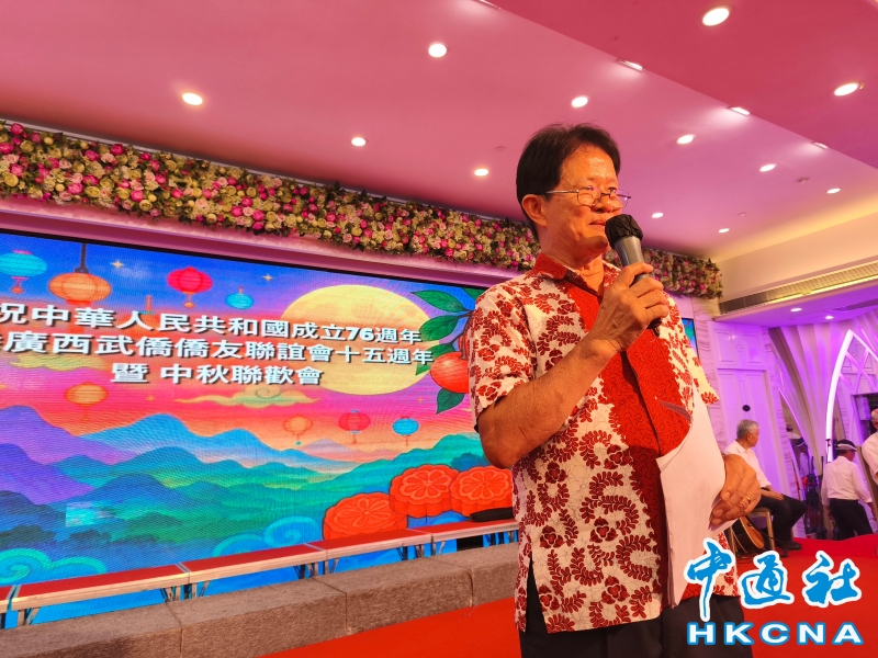 •   9月14日,香港廣西武僑僑友聯誼會十五週年暨中秋聯歡會在香港石門一家酒樓熱鬧舉行。廣西武橋僑友聯誼會是一家非冇利機構,成立於2010年,其宗旨是搭建一個平台,讓當地香港的廣西武僑僑友朋友們能夠相聚聯歡,促進彼此交流與聯繫,同時表達對國家的熱愛與支持。當天,現任會長余瑞源、副會長周國興、廖松才、榮譽會長李錦開、曾廣淼,名譽會長謝彬華、謝國昌、鄺福祥、邱鋼忠、黃桃蘭、林樹明等聯誼會成員出席。廣西武僑是位於廣西南寧市的“武鳴華僑農場”。該農場成立於1960年,是一個集聚了來自印尼、越南等東南亞9國的歸僑的大型華僑農場,現已發展成為廣西最大的歸僑聚居地,總面積約180平方公里,曾是國營農場,現在也是一個重要的經濟開發區。圖為會長余瑞源致辭。 香港中通社圖片