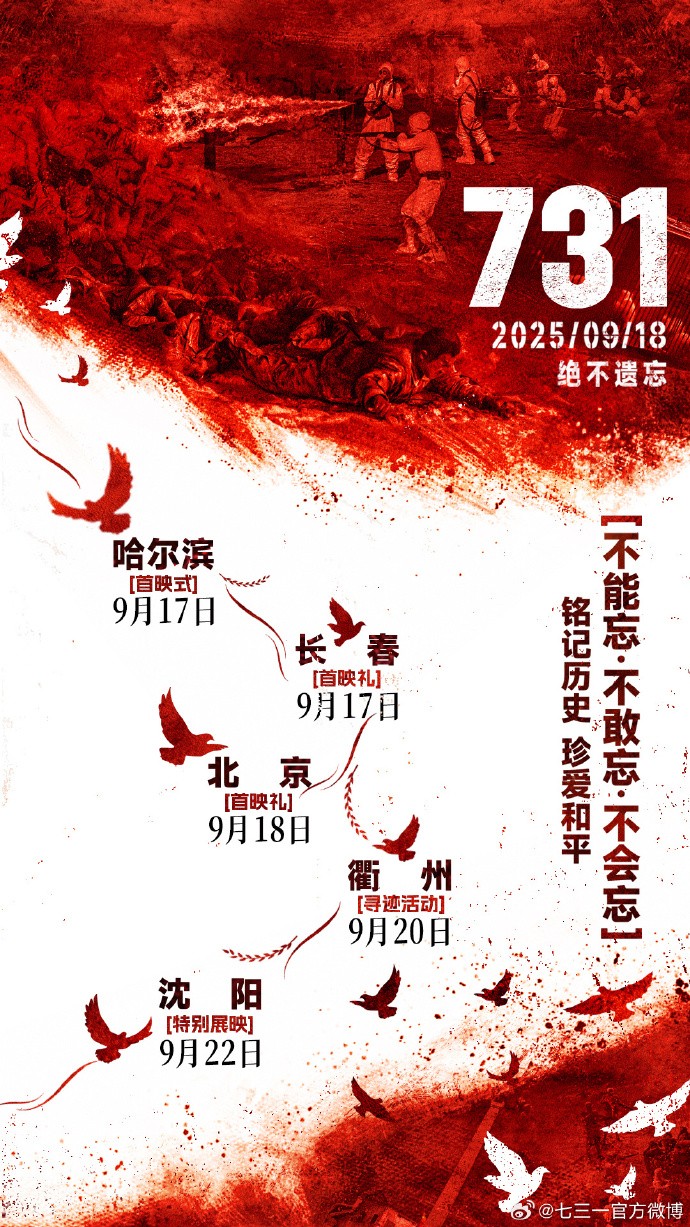 圖片來源:七三一官方微博 《731》聚焦二戰期間日軍“731部隊”在中國東北的細菌實驗,透過平民視角呈現上千名中國及國際遇難者被用作活體實驗材料的慘劇。影片將於9月18日在中國內地、中國香港、中國澳門,以及澳大利亞、新西蘭等地同步上映,其後將登陸北美以至歐洲等地。 延檔“九一八”:從數字巧合到歷史象徵 “原定7月31日上映僅與片名數字對應,未能深刻連結731部隊罪行。”香港歷史研究學者蔡思行16日對中通社指出,這日期僅是巧合,缺乏歷史深度。改至9月18日,則對應1931年“九一八”事變——抗日戰爭起點,東北淪陷後成為731部隊實施細菌戰和活體實驗的罪惡溫床。此調整強化歷史記憶的象徵意義,提醒觀眾這段長達十四年的抗戰歷程。 中國人民大學國際事務研究所所長王義桅認為,此調整有兩層解讀:一為避開南京大屠殺主題的電影《南京照相館》熱度,延長話題影響;二為與“九三閱兵”呼應,放大宣傳效果。更重要的是,“九一八”與731部隊暴行發生地東北高度契合,增強震撼力。 王義桅對中通社表示,日本曾試圖阻撓“九三閱兵”,暴露其拒不認罪態度,全球上映《731》有利於闡述正確二戰史觀,捍衛人類正義。731部隊的反人類罪行數據曾移交美國,影響1951年《舊金山對日和約》片面處理戰後問題,成為日本拒認罪的根源。 全球上映:打破西方壟斷與凝聚共識 蔡思行比喻,1993年上映的《辛德勒的名單》,電影讓全球關注納粹屠殺猶太人的罪行,《731》則將揭示亞洲同等令人髮指的罪惡。值得注意的是,納粹集中營由蘇聯軍隊發現,731部隊罪行則在1949年蘇聯主導的伯力審判中公開,這是人類史上首次對細菌戰的審判,卻長期被歐美史觀忽視,中國和蘇聯在二戰戰敗法西斯主義的貢獻也被長期低估。因此,《731》全球上映,可填補這一空白。 《731》從一開始定位“全球上映”,與西方對中國抗戰史缺乏認識甚至曲解,以及日本未反省歷史密切相關。王義桅指出,日本長期將自身塑為二戰“受害者”,強調原子彈爆炸之痛,卻避談其侵略罪行。美國作為“中途參戰者”——1941年珍珠港事件後方參戰,此前更透過《租借法案》牟利,其主導的史觀邊緣化中國十四年抗戰及蘇聯的貢獻。 蔡思行認為,在當下世界嚴重右傾和法西斯主義重燃的挑戰下,此片能警醒全球愛好和平的大眾,強調和平得來不易,強化人類命運共同體理念。因此,《731》的延檔與全球多地同步上映,不僅是檔期調整,更是歷史正義的宣示。(完) 【編輯:紀東】