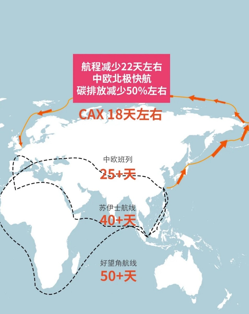圖自微信公眾號“寧波發佈” 據介紹,該航線取道北極東北航道,經白令海峽直達歐洲,單程18天左右,較傳統航線縮短22天,碳排放量降低約50%。這是繼寧波舟山港2024年底開通至德國威廉港的26天“中歐快航”後,再創中歐快航時效新紀錄。