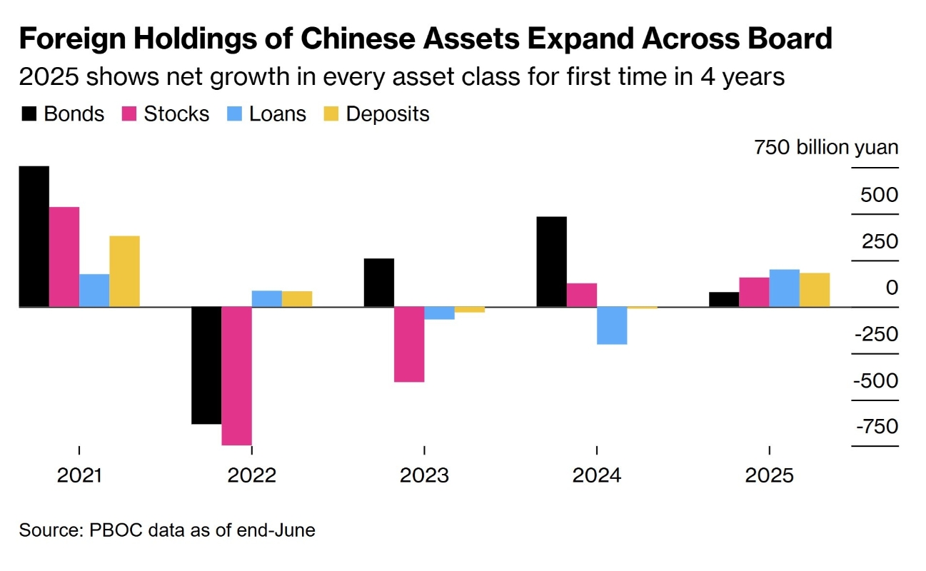 全球投資者對中國市場投資回流(圖源:彭博社) 信心增強 全球投資者對中國市場投資回流 2021年,高盛策略師在與客戶談論關於投資中國股票投資時給出的建議是“不可投資”,而近日太平洋投資管理公司表示,投資者對中國市場的信心增強,“他們現在更擔心錯失在中國投資的機會而不是風險。”彭博社援引富達國際投資組合經理Joseph Zhang表示:“全球投資者對中國資產的興趣明顯增加,”他本人也一直在增加在市場上的持股。 景順投資解決方案團隊多資產投資組合經理Chang Hwan Sung認為,隨著風險偏好持續改善和美元走弱,估值引人注目的中國市場將受益,因此,他的基金一直在增加對中國股票的配置。 官方數據顯示,中國內地跨資產類別的外國資金流入正在增加,今年上半年,外國投資者增持了在岸股票、債券、貸款和存款,這是自2021年以來首次同時增加。根據中國人民銀行的最新數據,截至6月份的淨流入量已經比2024年的年度數字高出約60%。 彭博社認為,“這種勢頭可能仍在繼續”。9月19日,中國國家外匯管理局副局長、新聞發言人李斌就2025年8月外匯市場形勢時表示:今年8月,中國外匯市場交易保持活躍,企業、個人等非銀行部門跨境收支1.3萬億美元,同比增長8%,跨境貿易和投融資穩步發展。 中國科技強勁表現讓海外投資者患上“錯失恐懼症”