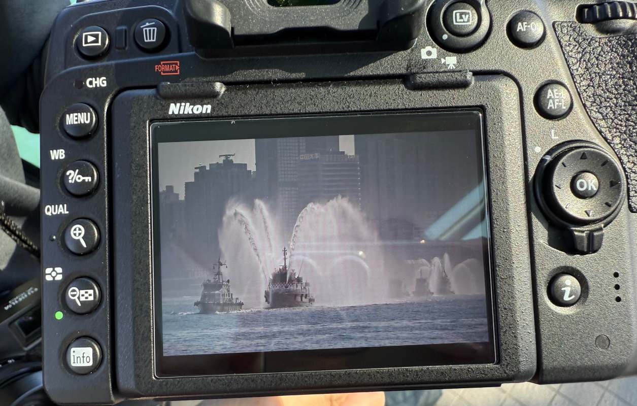 陳先生指,這次兩艘軍艦少見地從維港經過,能夠拍攝尖沙咀一側高樓林立的背景,很有香港特色。他留意到兩艘船以“水門禮”歡迎後,90度掉轉方向表示致敬,印象深刻。