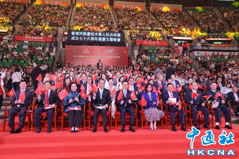 香港中通社10月2日電(香港中通社記者 張明臻)紫荊花開,香滿神州。10月2日晚,一場融合AI機器人、全運會、經典電影等元素的文藝晚會,在香港體育館上演,表達香港對祖國76周年華誕的美好祝願。 晚會由香港同胞慶祝中華人民共和國成立76周年籌備委員會主辦。當日,全國政協副主席梁振英、香港特區行政長官李家超、中聯辦副主任尹宗華、外交部駐港公署特派員崔建春、駐港國家安全公署副署長陳楓、解放軍駐港部隊參謀長魏德明少將、前行政長官林鄭月娥、以及一眾香港特區官員出席。