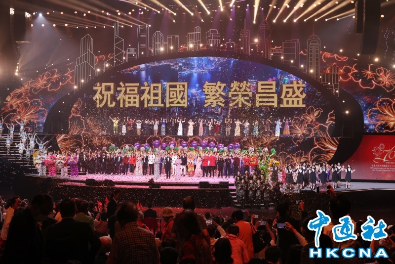 晚會圓滿結束,全體演出人員一同合影。(香港中通社圖片) 晚會在大合唱《我們的家》中落幕,香江兩岸的喜慶氛圍久久未散。(完) 【編輯:李冉】