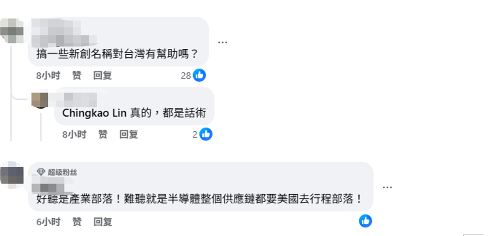 台當局的“台灣模式”方案亦在網絡引起廣泛討論。在相關消息下方的評論區,有網友揶揄,“搞一些新創名稱對台灣有幫助嗎?”直指民進黨當局不過是換了一種好聽的“話術”,所謂“在美打造產業聚落”,恐怕實際是台灣“半導體整個供應鏈都要去美國形成聚落”。