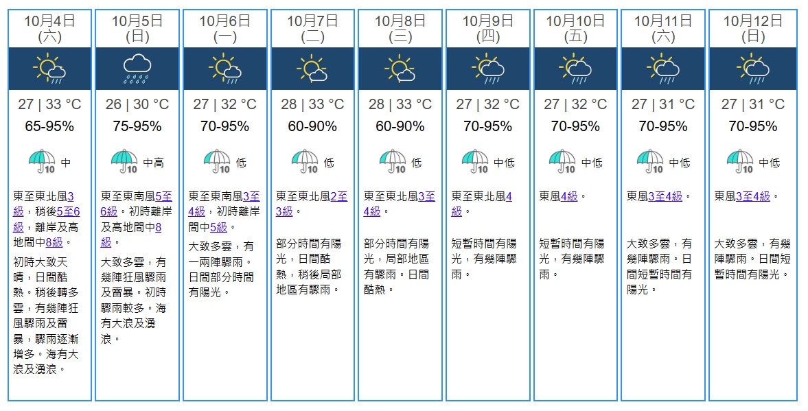 香港新聞網10月4日電 香港天文台在今天(10月4日)中午12時20分發出三號強風信號,並表示至少維持至晚上10時,隨後視乎其強度、烈風區及本地風力變化等,評估是否改發更高熱帶氣旋警告訊號。