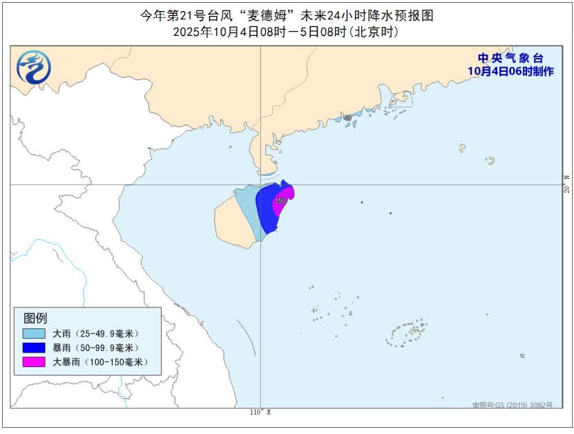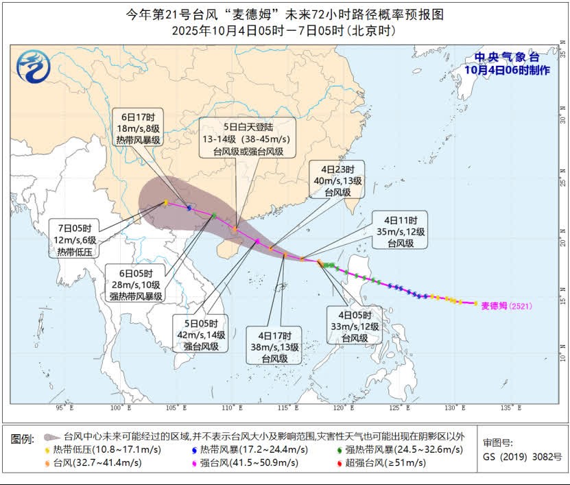 中央氣象台網站截圖 大風預報:4日08時至5日08時,巴士海峽、南海北部和中部海域、東沙群島、西沙群島、中沙群島及黃岩島附近海域、北部灣中東部、瓊州海峽、廣西沿海、廣東西南部及沿海、海南島及沿海、台灣島南部沿海有5-7級、陣風8-10級的大風,其中,南海西北部海域、瓊州海峽、廣東西部沿海、海南島東部和北部沿海的風力有8-11級,陣風12-13級,“麥德姆”中心經過的附近海域或地區風力可達12-14級,陣風15-16級。