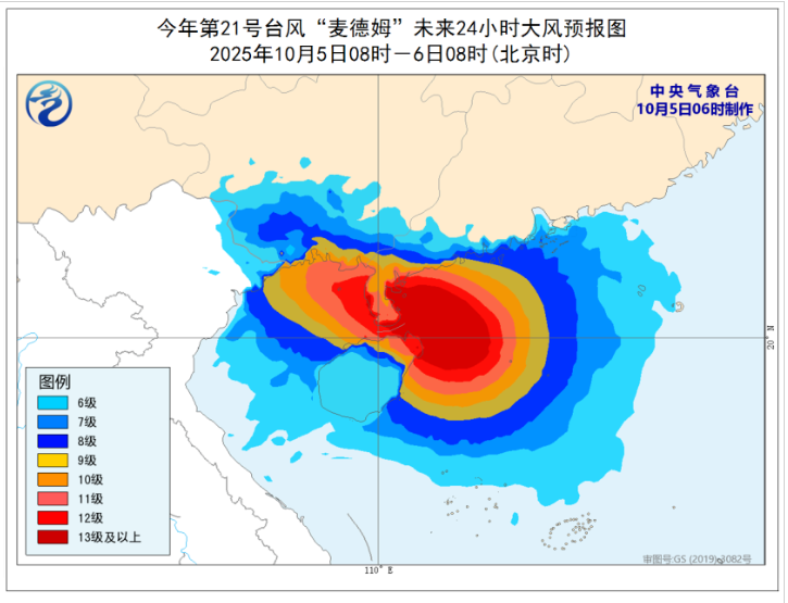 颱風“麥德姆”靠近中國內地城市。圖源:中央氣象台。 預計,“麥德姆”將以每小時20~25公里的速度向西偏北方向移動,強度還將有所加強,并將於今天(5日)中午前後在廣東吳川至海南文昌一帶沿海登陸 (強颱風級,14級,42~45米/秒),登陸後強度逐漸減弱。 10月5日8時至6日8時,南海西北部和中西部海域、東沙群島、西沙群島、北部灣、瓊州海峽、廣西南部及沿海、廣東南部及沿海、海南島及沿海將有6~8級、陣風9~10級的大風,其中,南海西北部海域、瓊州海峽、北部灣北部海域、廣東雷州半島及沿海、廣西沿海、海南島東部和北部沿海的風力有9~11級、陣風12~13級,部分海域或地區風力可達12~14級,陣風15~16級。